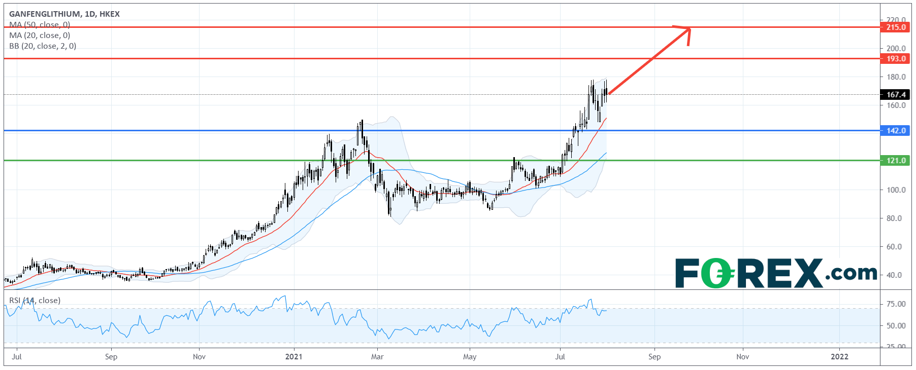 在日线图上,赣锋锂业的涨势超出我们6月时预测的目标,目前技术走势依然强劲。它在20日及50日移动线上方交投,相对强弱指标未出现看跌背离。