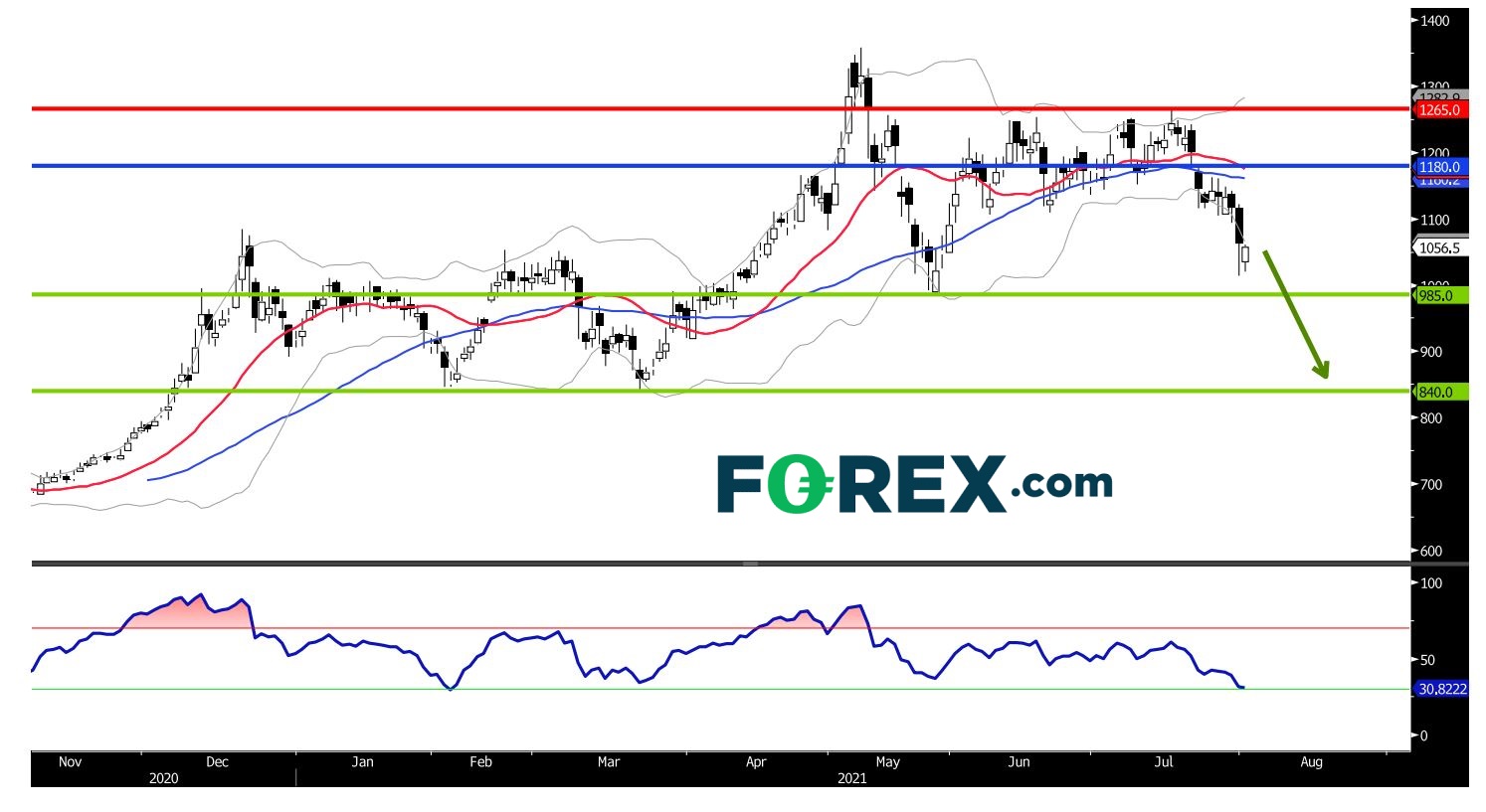 铁矿石期货价格已跌穿支持位1,075元人民币,正向另一下行目标985元人民币 (5月低位) 进发。若985元人民币失守,价格将跌向840元人民币 (3月低位)。