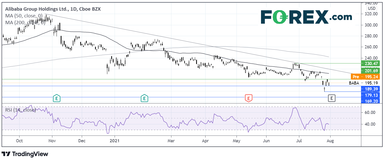 阿里巴巴股价疫情期间大幅上涨,2020年10月中旬攻入314美元历史高点。自那以来,股价大幅下挫,上周跌至179美元年内低点。价格此后略有回升,但日线图仍然看跌。