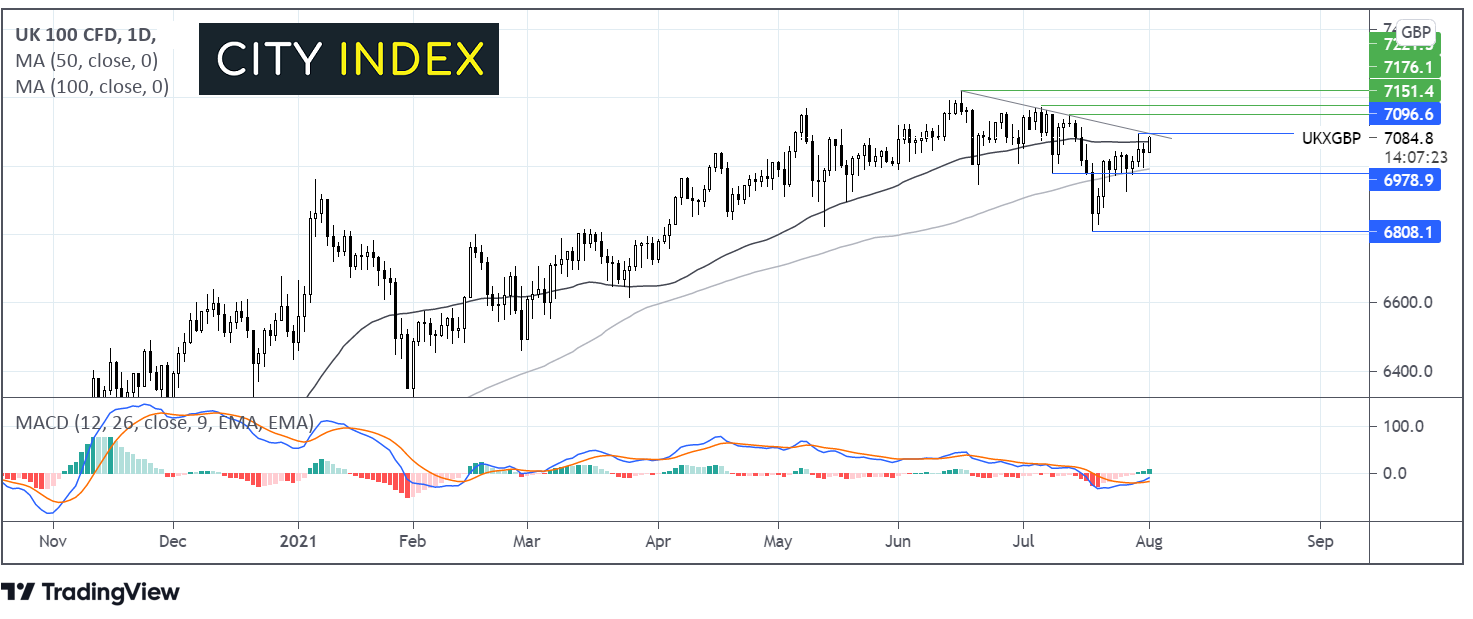 MACD指标看涨交叉支持股指进一步上行。即时支撑位在6月16日以来下行趋势线和上周高点。若拿下,则看向7月13日高点7150,然后是7月高位7180。