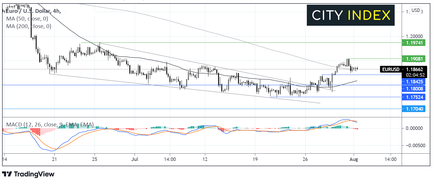 欧元/美元上周突破下降楔形,收复4小时图200均线并触及阻力1.1908。货币对周五回落,结束四连涨,之后于1.1855获撑。