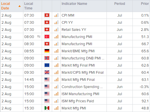 英国制造业PMI将于英国夏令时09:30发布,预计持平于60.4 (但呈扩张趋势)。15:00揭晓的7月ISM制造业指数为今天经济日程重点。6月整体数据报于60.6,表现相当强劲,不过已自3月64.7高点回落。鉴于支付价格为通胀输入参数,因此市场将重点关注其表现(目前落在92的创纪录高位)。整体数字预计将小幅升至60.8。Markit也将发布7月PMI终值。