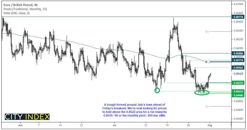 欧元/英镑在日线图画出两条小型十字线后上周未能探入新低,之后于周五反弹上行。阻力落在20日均线,汇价可能自当前水平回落,但我们在等待0.8522突破水平上方低点抬高。若汇价可以守在0.8522区域上方,我们将考虑该水平附近做多,目标月线图支点和200均线略下方的0.8560。