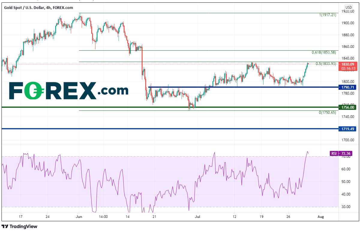 而在4小时图上,金价正上攻6月1日高点到6月29日低点行情的50%回档位,与此同时RSI落入超买区域。如果黄金确实自当前阻力位回落,下方略低的200天均线所在的1821构成支撑(请看日图)。更多的支撑位在长期趋势线(同样在日图上)1806附近、下方不远处的水平支撑位1790。
