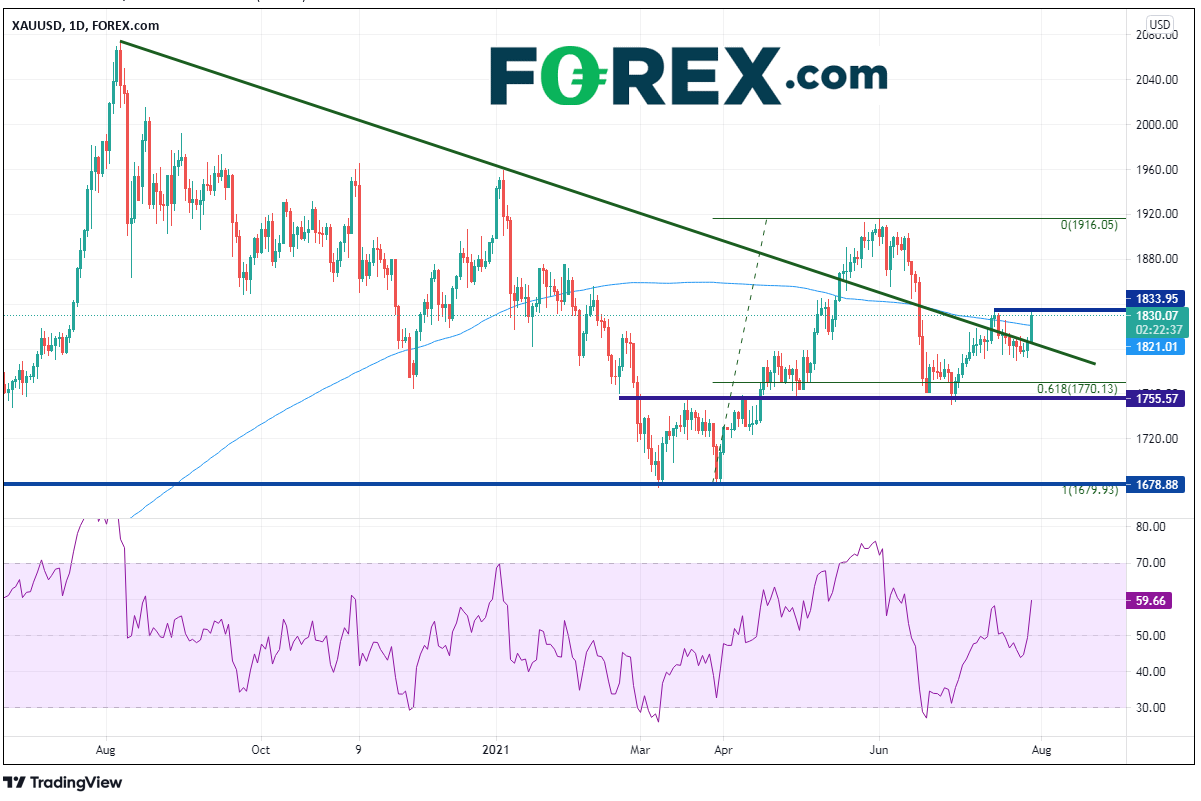 美元因此走弱,黄金与白银则走高。但贵金属还有多少上涨空间?我们从现货黄金/美元的日图上可以看到,此贵金属近期回撤并在3月双底1678到6月1日高点1916的上涨行情的61.8%回档位处构筑双底。在此之前,8月7日历史高点以来的较长期下降趋势线一直构成阻力位,这足以和200天均线一起在7月中旬阻碍黄金上涨,致其回到趋势线下方。但金价在FOMC新闻发布会后一举击穿该趋势线、200天均线并上攻水平阻力位1834。