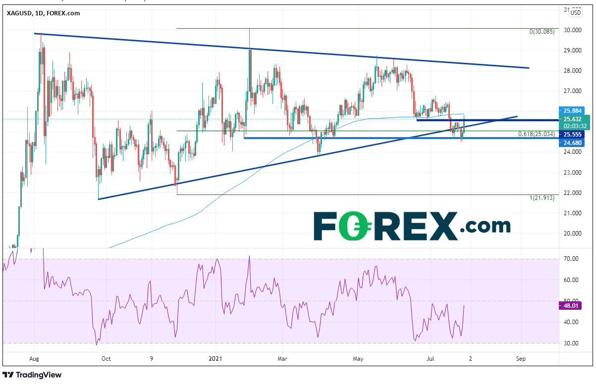 自从8月7日形成高点(同一天黄金创下新高)以来,白银一直处于一个对称三角形中,回落并守住2020年11月30日低点到2月1日高点行情的61.8%回档位25.00附近。7月20日以来,白银一直围绕着对称三角形的下轨趋势线和水平支撑位构成的24.50-25.00区间震荡。今天,银价回到了25.88附近,即趋势线、水平阻力位和200天均线相汇的水平之上。上档其它阻力位有27.03的水平阻力位、三角形下降趋势线所在的28.30附近。近期支撑位在三角形趋势线25.20附近、周二低点24.50,然后就是较远的21.86,那是3月30日低点。
