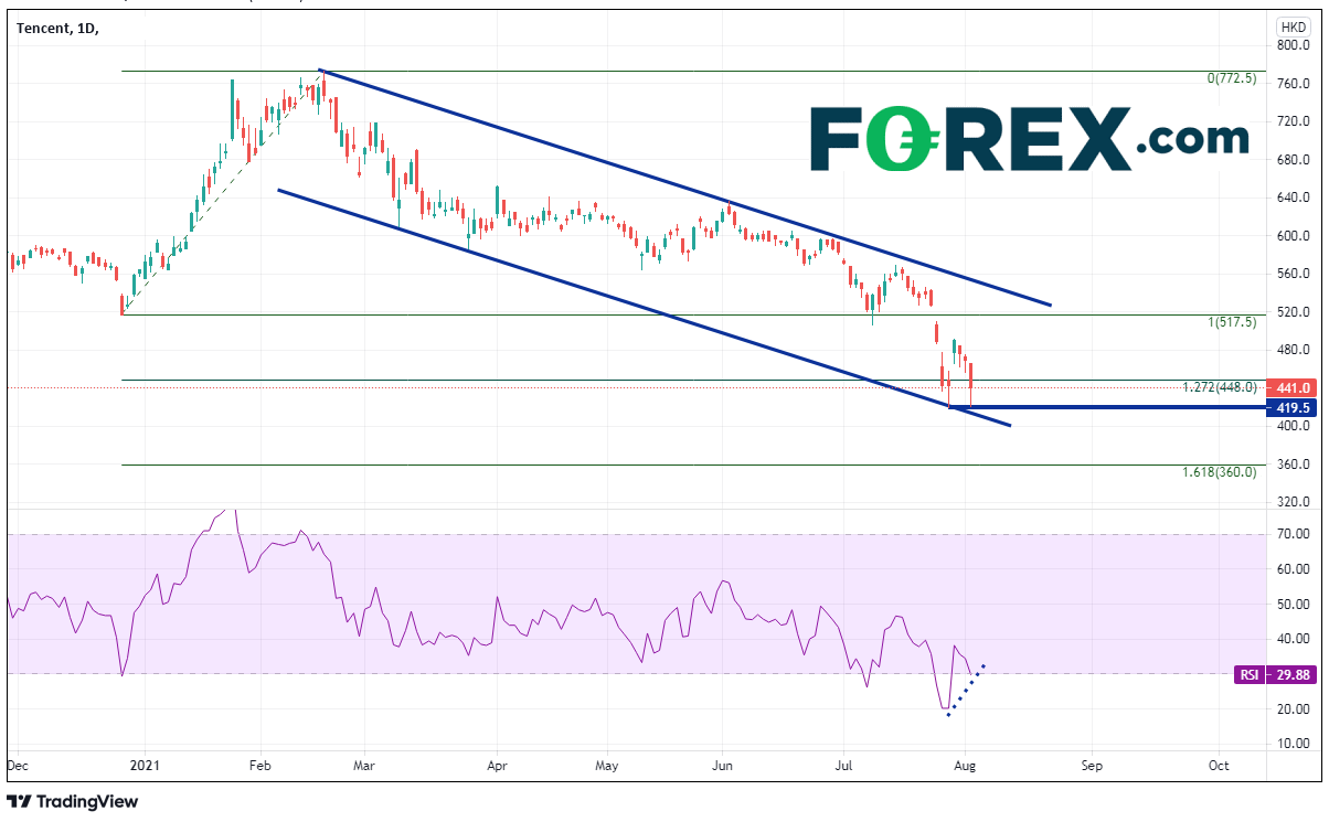 除了日图上的水平支撑位,腾讯股价4小时图显示,股价正在考验始于“头部”顶点的下降通道的下轨趋势线,还逼近12月28日低点到2月18日高点的127.2%扩展位,即448附近。另外,RSI正进入超卖区域且与价格背离。股价可能展开反弹。419.5下方的支撑位还有前述行情的161.8%扩展位360、2020年3月低点323附近。阻力位在7月29日高点491.5、水平阻力位597。