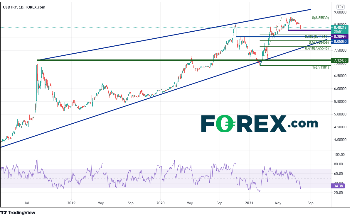 2018年8月以来,美元/土耳其里拉一直处于长期上升楔形中。该货币对从当时的历史高点7.1244回落并形成上升三角形。2020年8月,美元/土耳其里拉暴力上破后持续走高,在逼近楔形尖端时于6月初在8.850附近创下历史新高。