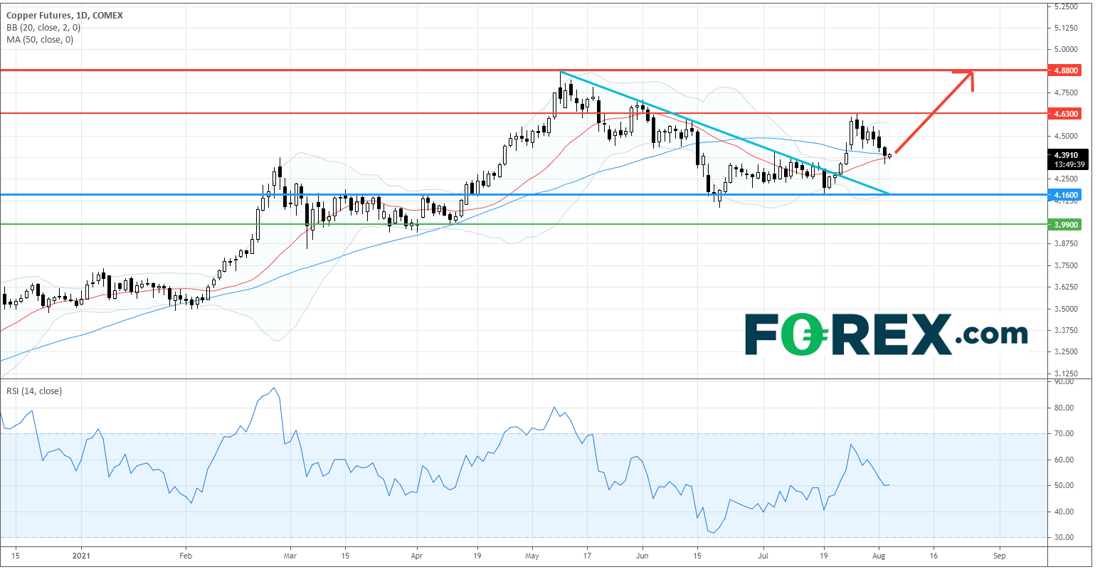 在日线图上,铜期货上涨至4.63美元 (每磅) 后稍作整固,目前上升20日均线正在支持价格。相对强弱指数的上升走势不变。技术配置表示铜期货的走势维持看涨。