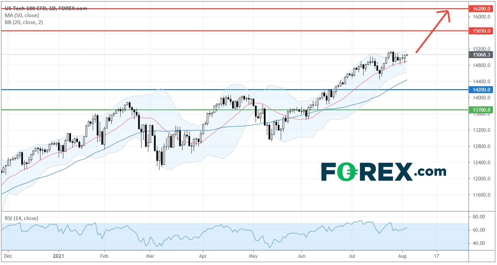 而相对强弱指标站稳在50点水平之上,即美国科技股100指数CFD仍未见下行动能。