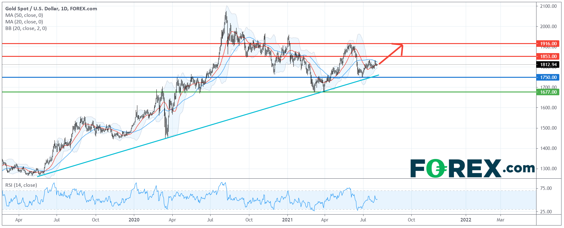 在日线图上,现货黄金技术走势仍在组织反弹。目前,2019年5月年以来的上升趋势线依然有效,20日移动均线已反转向上。 只要主要支持(止损)位1,750美元不破,价格可望挑战上方目标1,853美元及1,916美元。
