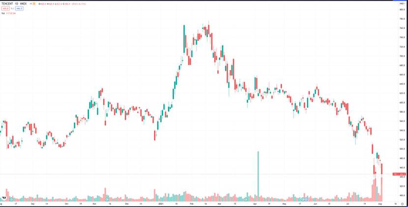 腾讯股价走势。来源:Tradingview,截至2021年8月3日收盘