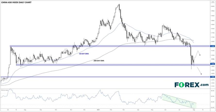 嘉盛集团全球研究主管Matt Weller近期就对该指数进行了技术分析——观察A50指数的走势图便可发现(https://www.forex.com/en-ca/market-analysis/latest-research/china-a50-index-in-focus-assessing-the-fallout-from-last-weeks-selloff/),该指数在7月26日开始的那周初跌破了年初以来的低点16500点左右的支撑位后,整体指数瞬间崩溃,逼近下一个主要支撑位15000点左右。尽管此后价格在该区域上方趋于稳定,但A50的技术前景仍然脆弱。14日相对强弱指数(RSI)仍处于看跌通道内,显示出不断增加的抛售压力,看跌者暂时占据上风。