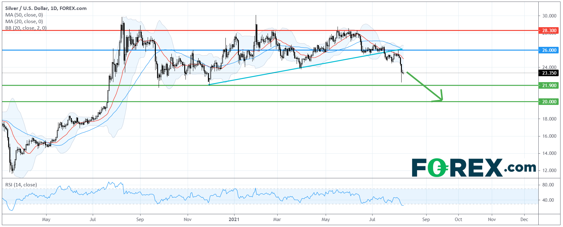在日线图上,现货白银的技术走势开始转弱。它已跌破了去年12月以来的上升趋势线,并正在测试过去一年的盘整区底部。
