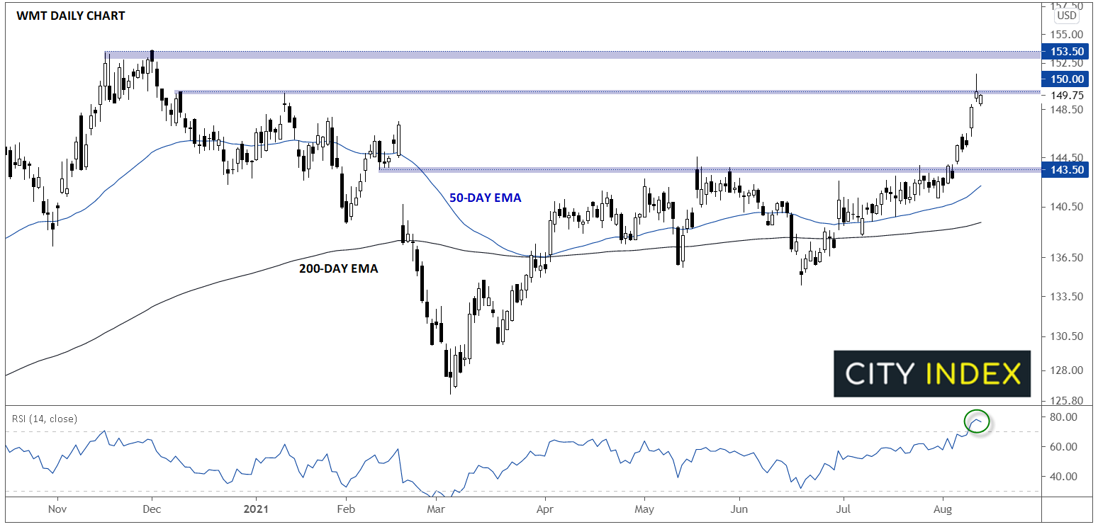 从图表来看,沃尔玛过去两周中有所上扬,这家大型零售商股价已自低位140美元上涨至约150美元;虽然从百分比上看,涨幅并不明显,但仍意味着自本月初以来,沃尔玛市值增加了200多亿美元。