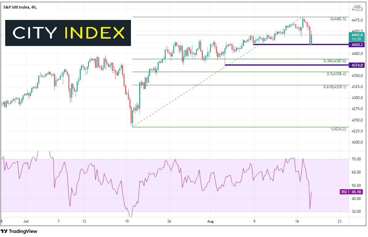 在上述消息和经济数据背景下,再加上7月FOMC会议记录的推动,标普500指数周三很可能继续走弱。标普500指数4小时图从周一历史高点4482下跌并在周二守住水平支撑位4417.5附近。如果市场继续下跌,周二低点下方的第一支撑位在7月19日低点到周一高点的38.2%回档位4387.6附近,然后是水平支撑位4374。该位是关键,如果失守,下方能够守住标普500指数的只有4358.4和4329.1这两个斐波纳契回档位。如果再度失守,可能跌至4234.2。上方的盘中阻力位在4453.1,然后是周一高点4475、日图楔形的上轨趋势线4525附近。
