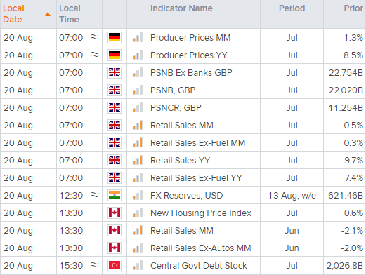 德国7月生产者价格指数将于英国夏令时07:00发布,预计上涨0.8%,低于6月的1.2%,同时出炉的还有英国零售数据。鉴于上月销售数据涵盖了英国解封初期,今天的零售额数字可能会走软。