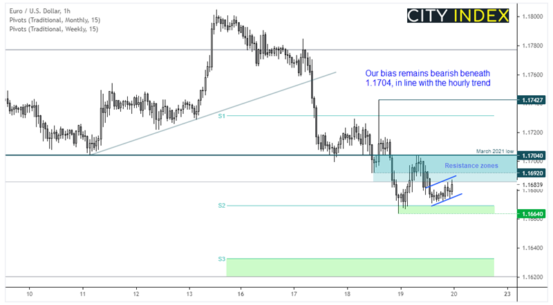 与我们昨天的看涨观点一致,作为反趋势行情的一部分,欧元/美元自周线图2号支撑反弹冲高。然后汇价在2021年3月低点遇阻后再次转跌。小时图趋势仍然看跌,汇价隔夜一直在潜在熊旗内部横盘。但目前来看,我们仍于1.1704下方看跌,汇价或探入新低。