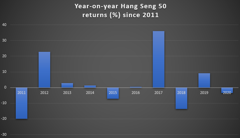 下图是恒生指数2011-2020年的年度回报。请记住,过往回报不能保证未来业绩。(来源:Macrotrends)