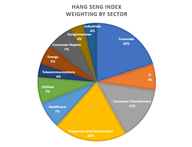 恒生指数的成份股分为金融、地产、公用事业和工商业等类别,按权重计算的最大成份股是中国公司,比如腾讯和阿里巴巴,另有起源于英属香港时期的汇丰银行、泛亚保险巨头友邦保险集团等备受瞩目的企业。