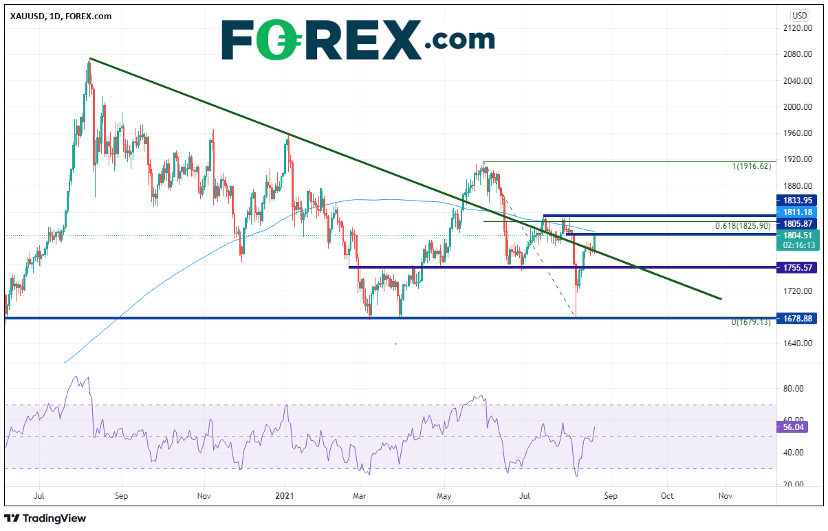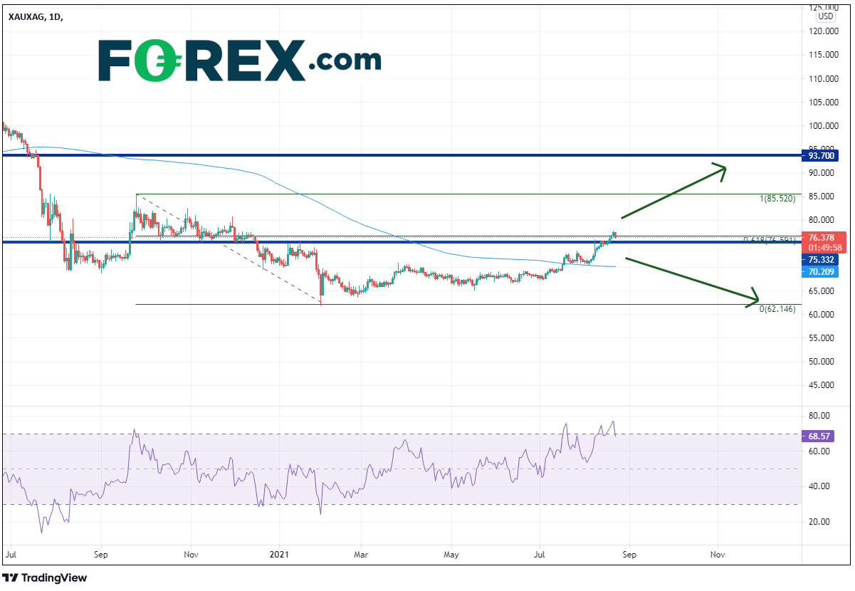 接下来看黄金/美元比率。同一时间周期内,该比率一直在62.066-85.82区间内波动。黄金/美元比率在2月1日最低触及62.066(同一天白银创下历史高点),此后始终处于横盘/上涨模式。7月19日,该比率攻克200天均线70.735附近,随后的8月18日上破水平阻力位75.332附近。上周五,黄金/美元比率成功击穿2020年9月24日高点到2021年2月低点行情的61.8%回档位76.582附近,但周一又回到了该位之下。另外,RSI刚刚从超买区域(70)回落,后市可能向下。如果确实如此,近期黄金表现可能不如白银,后者可能是相对较好的买入选择。不过,该比率如果守住前阻力位75.332,后市可望继续上涨,目标前高点85.52。那样的话,相对白银,黄金可能是更好的持有对象。