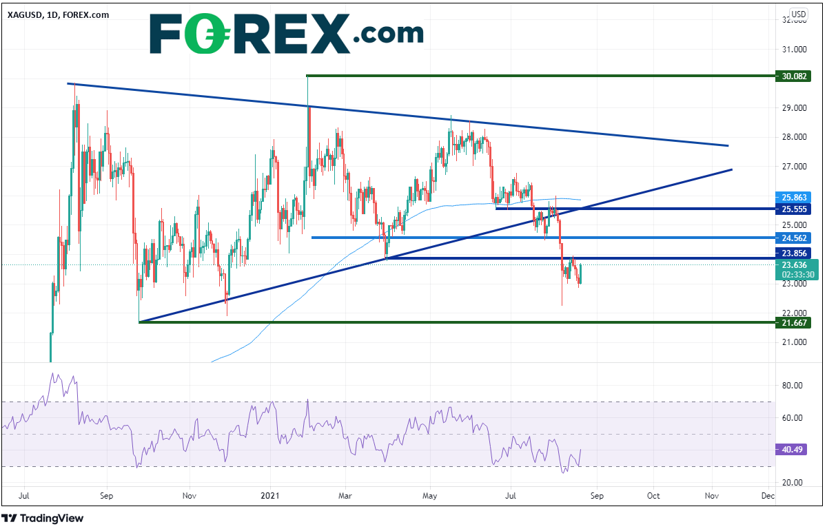2020年8月7日,白银创下历史高点29.857,并且自此启动长期对称三角形形态的形成过程。银价于2020年9月24日最低跌至21.667,但在Reddit用户的推动下自26.991反弹,一路高歌猛进攻克前高点,比之高出几美分。随后此贵金属在前述对称三角形内震荡,直至8月6日暴力下破,至22.529。银价目前在三角形下方3美元左右,但逼近前支撑位现阻力位23.96。如果站于其上,后市可能先后上看24.562和25.555。