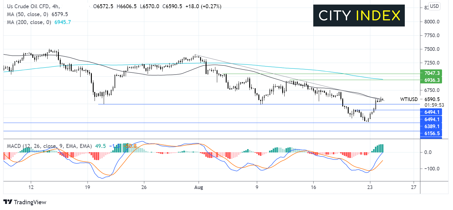 原油正在扩大涨幅,试图升穿4小时图50均线及7月初以来下降趋势线。