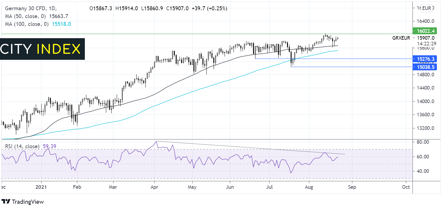 DAX指数上周自日线图50均线反弹,在多头主导之下继续上涨,攻向16000和历史高点。