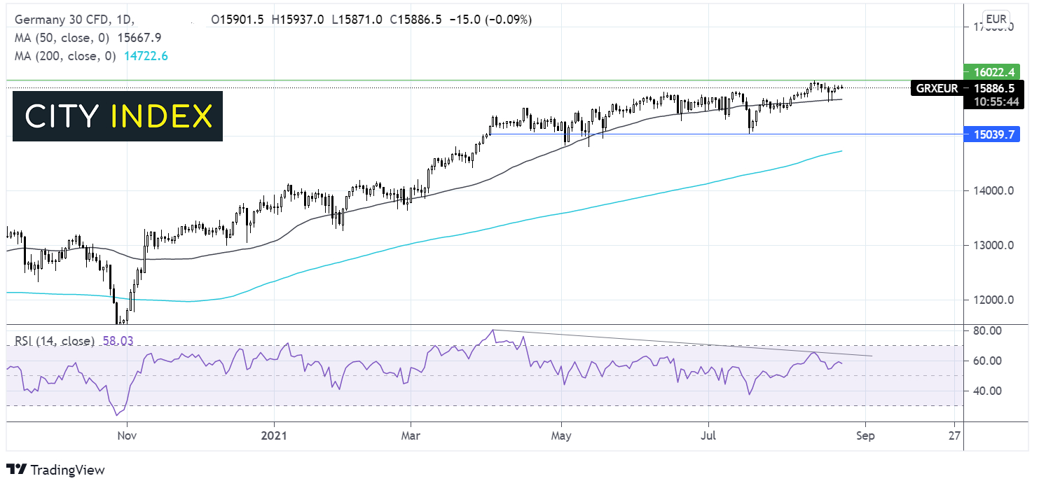 Dax指数自50均线的反弹现已于16000附近停滞。指数今年以来持续走高,看涨趋势保持完好,所以我们或很快看到价格再度测试16000。若升穿则构筑看涨信号,或促使价格攻入历史新高。但需要指出的是,RSI看跌背离表明动能正在放缓。