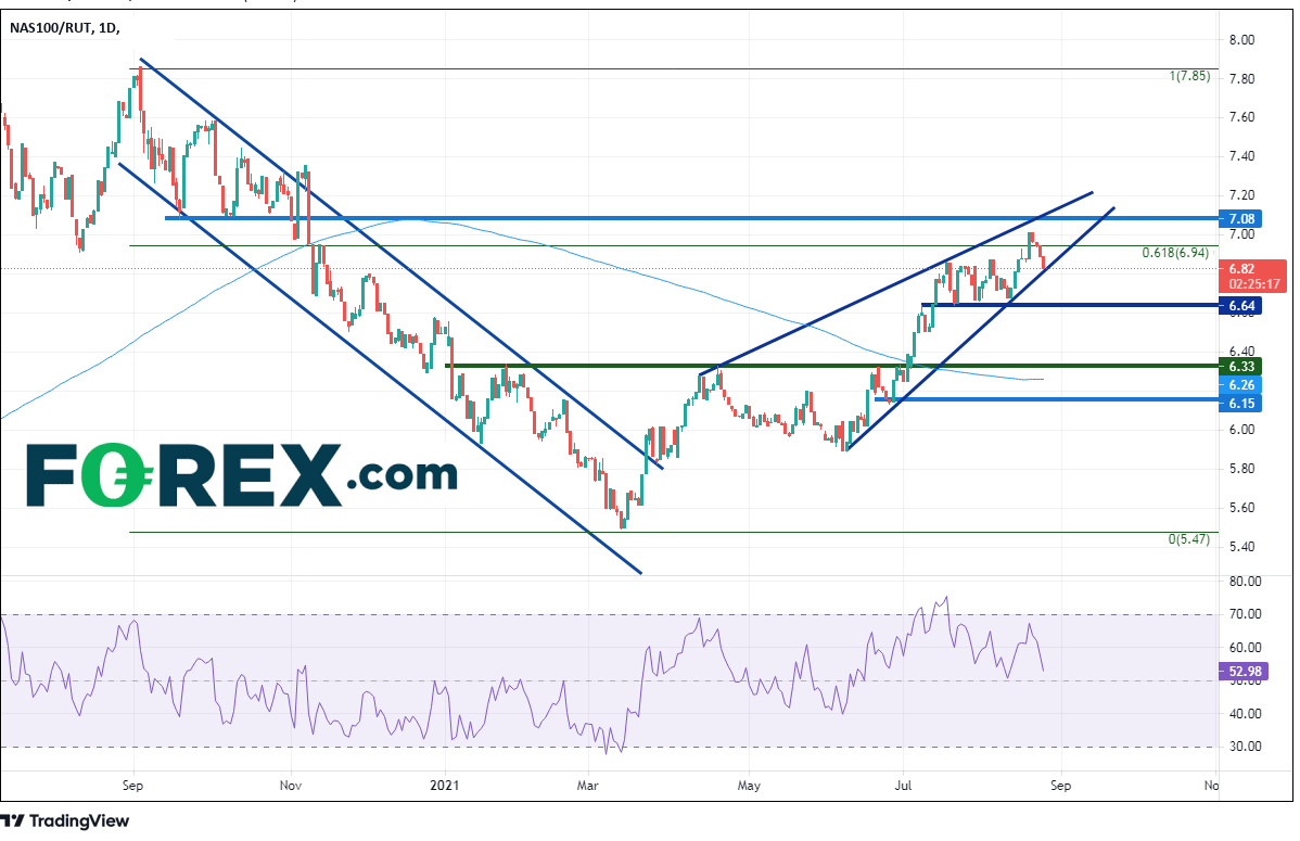 NASDAQ 100/Russell 2000展示两者之间的比率,当数字上升,纳斯达克100指数表现更好,而当数字下降,表明Russell 2000的表现更佳。我们从下图可以看出,从2020年9月一直到3月中旬,该比率一直在下降,原因是投资者担心经济活动将要重启。受益于“居家令”的纳斯达克100指数的表现不及受益于“外出解禁令”的Russell 2000指数,后者这个衡量家庭经营式小企业表现的股指中的酒店与休闲娱乐板块涨势突出。到了3月中旬,美联储主席鲍威尔表示,美联储开始缩表之前需要看到“更多实质性进展”。但投资者并不相信鲍威尔关于通胀将是“暂时现象”的说辞,随着通胀与通胀预期升温而变得惴惴不安。纳斯达克100指数也随之开始跑赢Russell 2000指数。