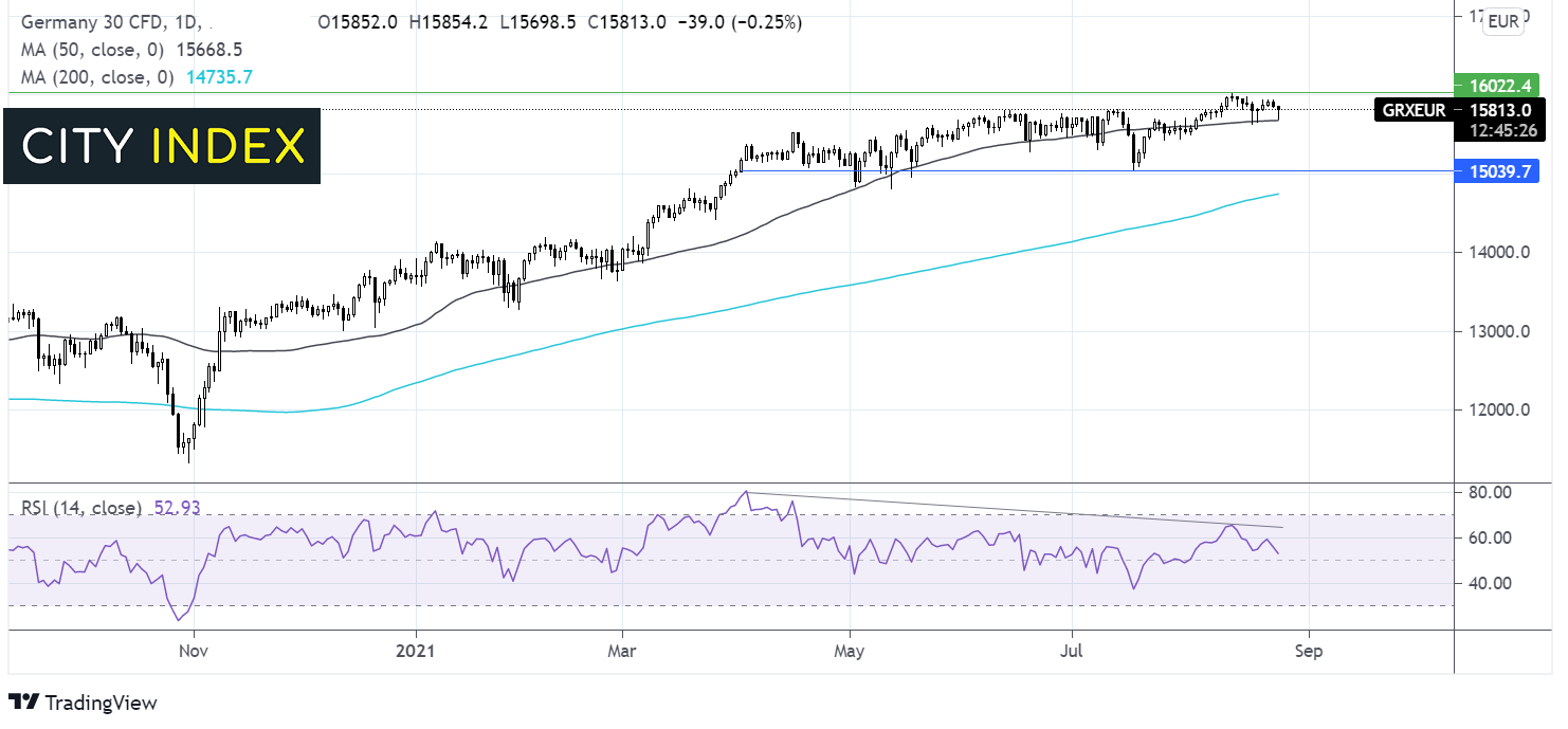 Dax指数早盘再度于50均线15675获撑。50均线在今年冲高过程中一直充当重要支撑。指数今年以来持续走高,看涨趋势保持完好,所以我们或很快看到价格再度测试16000。若升穿则构筑看涨信号,或促使价格攻入历史新高。但需要指出的是,RSI看跌背离表明动能正在放缓。
