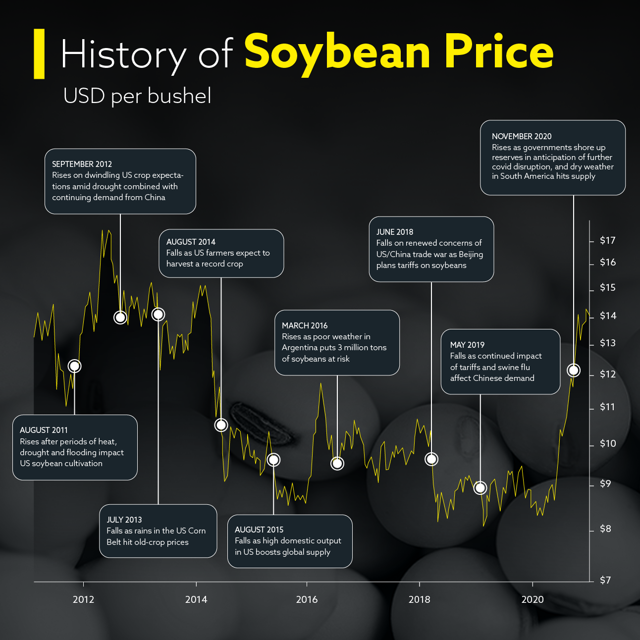 下图是大豆价格过去十年的历史,请观察该图表并从中了解驱动该大宗商品价格的一些关键基本面因素。