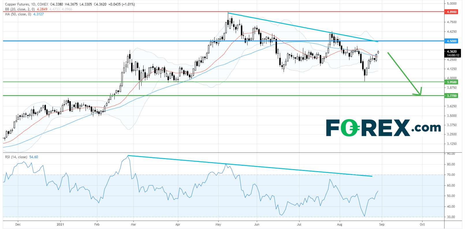 在日线图上,铜期货依然处于大型的整固区间内操作。目前,铜价虽然由3.95美元反弹并升破20日和50日均线,但仍在5月高位拉出的下降趋势线的下方。相对强弱指数的反弹亦可能受下降趋势线的限制。