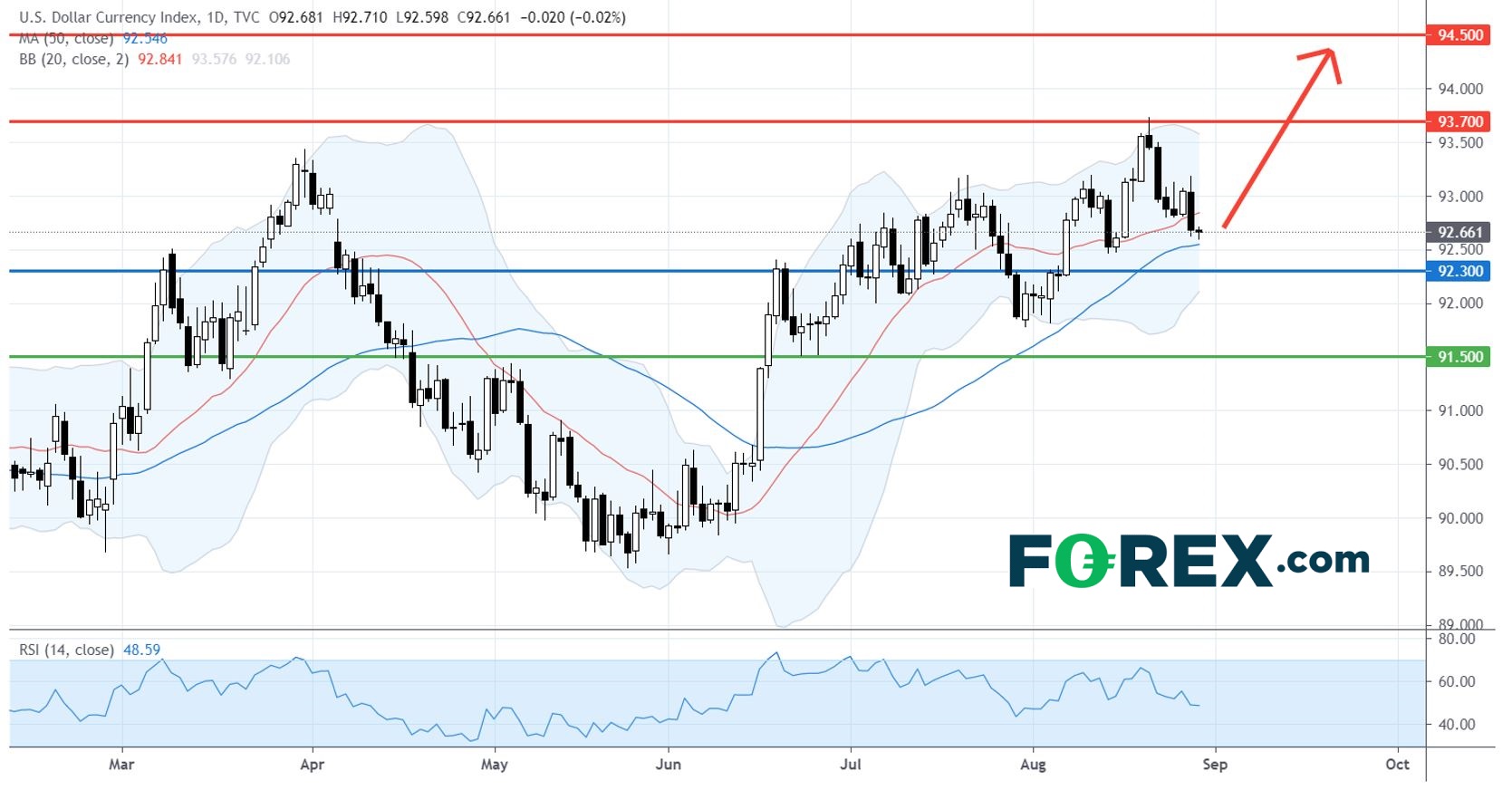 相反,若跌穿92.30 点,美元指数短期将返转看跌,下一道支持位在91.50点。