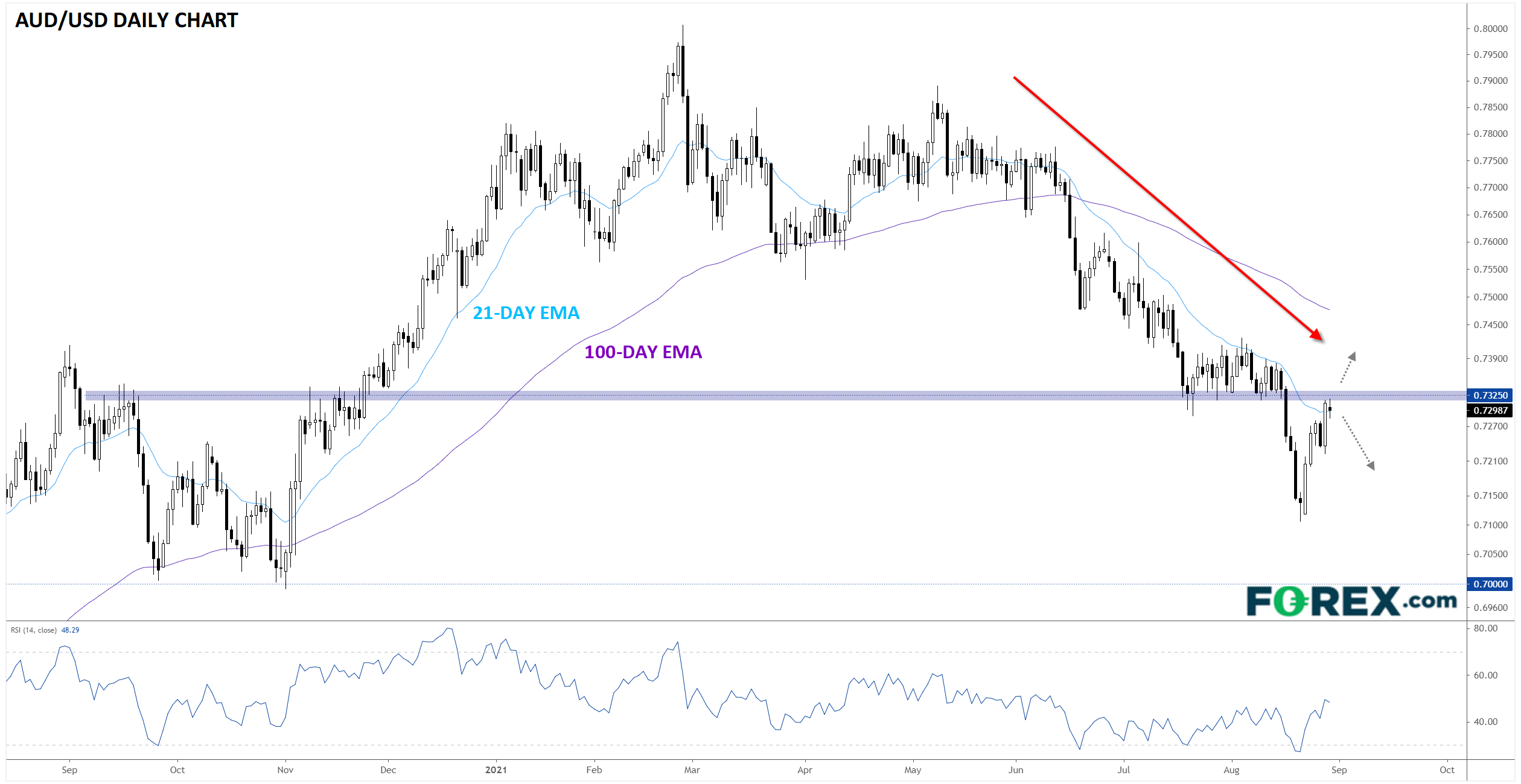 值得注意的是,0.7325为7月底到8月初的关键支撑区域。作为支撑位,该区域未来可能转变为阻力位。与此同时,21天指数移动均线(下图淡蓝色的曲线)自6月中旬以来始终压制短线反弹,进一步强化了0.7300-25区域的阻力地位。