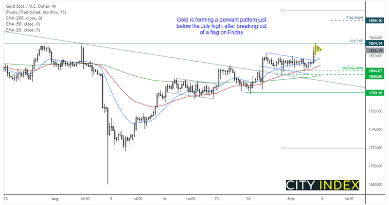 上周五黄金受疲弱非农就业报告的影响,到达我们的目标1834,4小时图突破看涨旗形形态,目前就在7月高点下方盘整,有可能形成三角旗形态。考虑到金价在4小时图上的看涨结构以及高点处形成的延续形态,我们现在等待站上1835,以确认其上涨趋势延续。如果确实站于其上,三角旗形态的目标大致在1859。