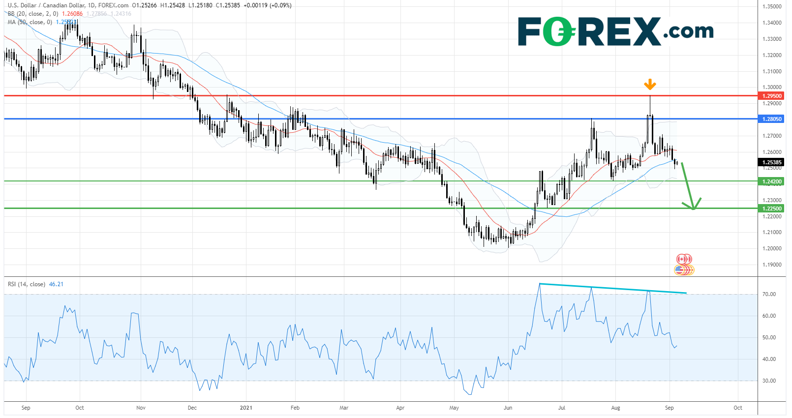 在日线图上,美元/加元突破7月的高位后迅速回落,并形成黄昏之星的看跌阴阳烛形态。目前,滙价跌穿了20日和50日均线,相对强弱指数显示了看跌背离的讯号。