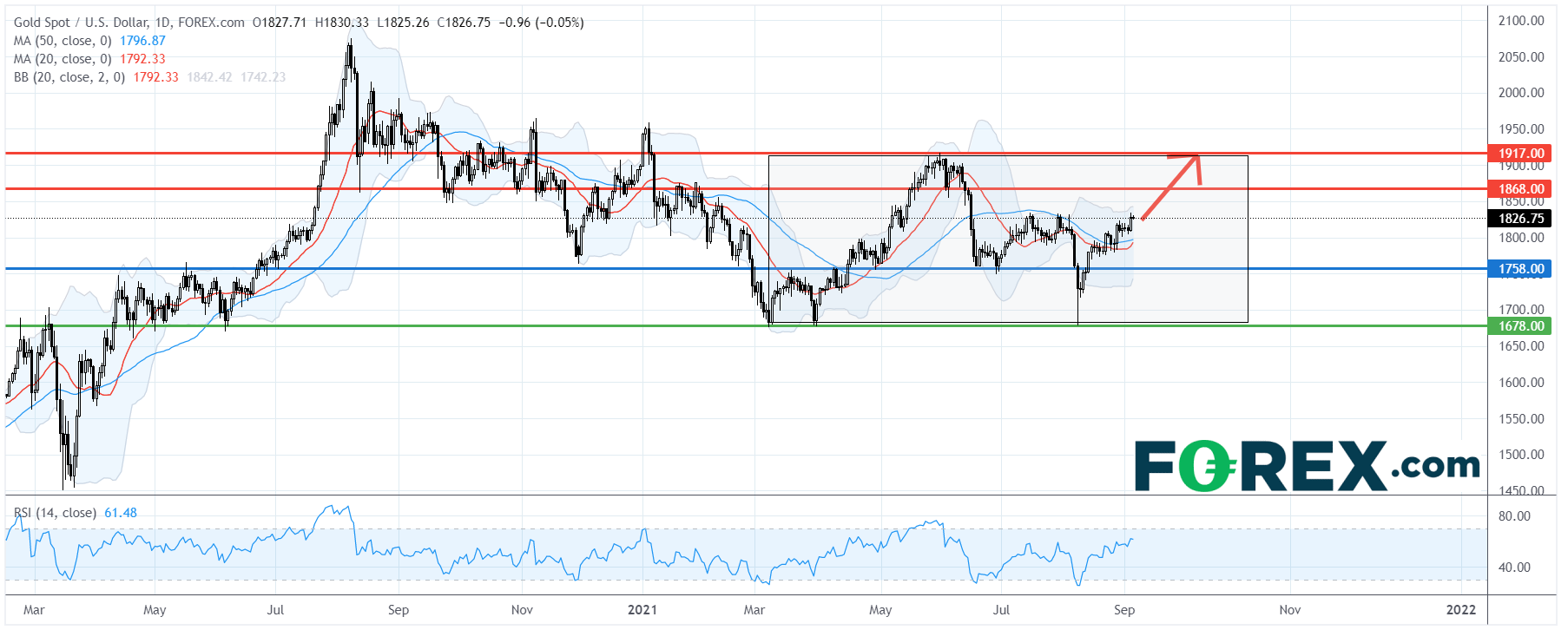 看漲的投資者可將1,758美元視為主要支持(止損)位,上行目標在1,868美元及1,917美元。