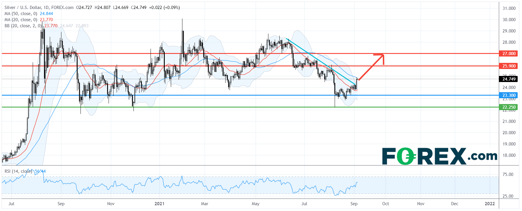 现货白银(XAG/USD):技术性反弹,首个目标25.90美元