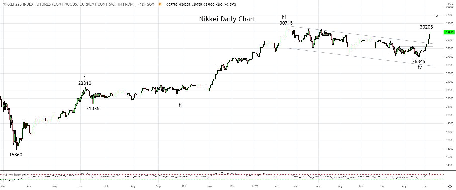 虽然日经股指期货此后回落至3万点下方,但涨势仍将继续。如下图所示,日经指数仍在测试并力图攻破上周文章中提到的2月高点30715。