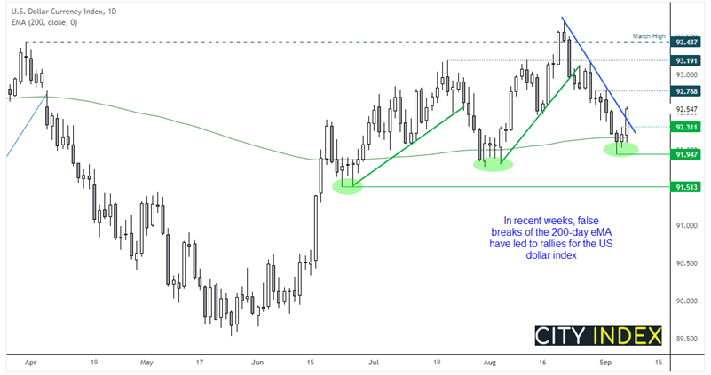 美元指数呈现强烈的信号,其已于92.0附近形成波段低点。美元指数昨天上涨0.38%,涨幅为12个时段之最。美元指数的上涨区间向上扩大,低位构筑两根小型的压缩K线后从200天指数移动均线反弹。另请注意,这些相似的形态先后出现在6月底、8月初和现在的9月初。