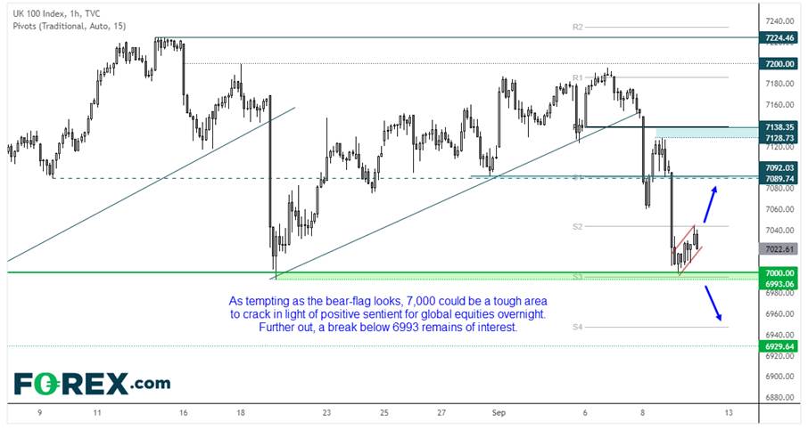 空头昨天干净利落地将富时100指数推过7000点目标,开盘后一个小时的交易覆盖了大部分日波动区间。单独来看,小时图看跌旗形似乎具有相当的做空吸引力。但鉴于全球股市情绪改善,加之7000为周图3号支点附近整千点心理水平,我们今天可能看到股指迎来反趋势反弹。7060和7090为可行看涨目标。若进一步下穿6993,或标志着股指面临新一轮推低。