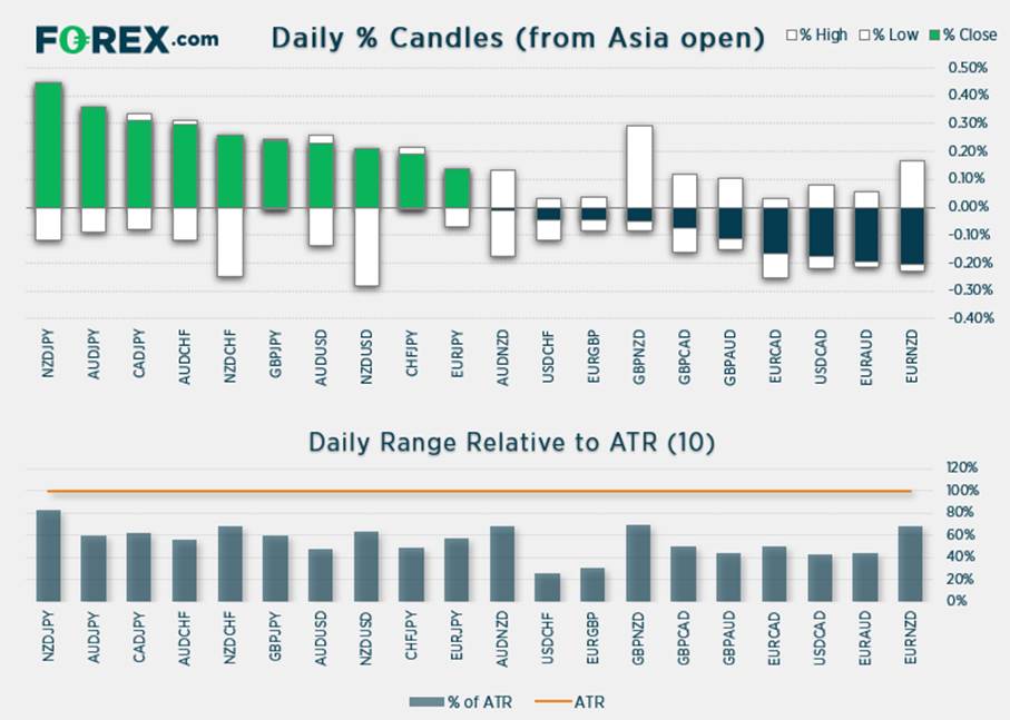 商品货币隔夜表现优异,澳元上涨0.3%,纽元上涨0.23%,加元上涨0.16%。日元和美元在温和避险交投中表现最为疲弱。