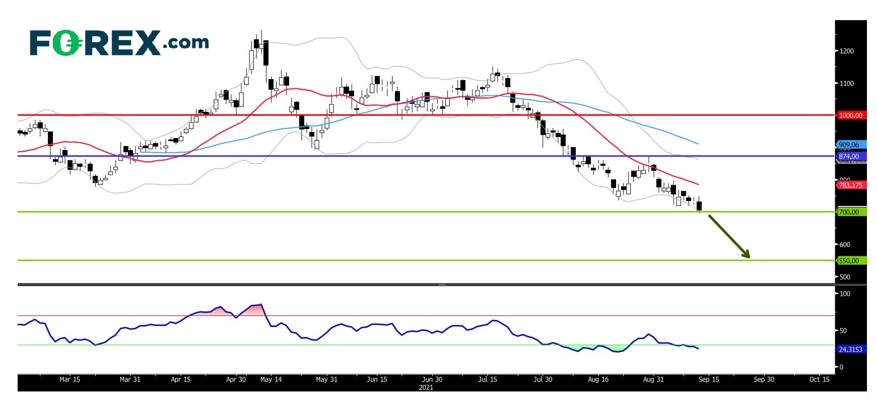 若铁矿石期货价格跌破700元人民币大关,将很大机会下滑至550元人民币。看跌的主要阻力 (止损) 位在874元人民币 (近布林带上线)。