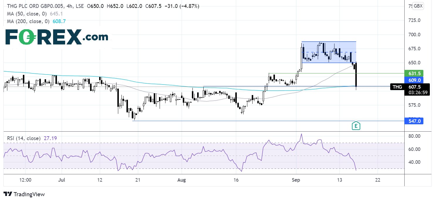 股价已跌穿下轨650便士,现正测试4小时图200 均线610便士支撑位,这也是8月高点转为支撑位的前水平阻力。
