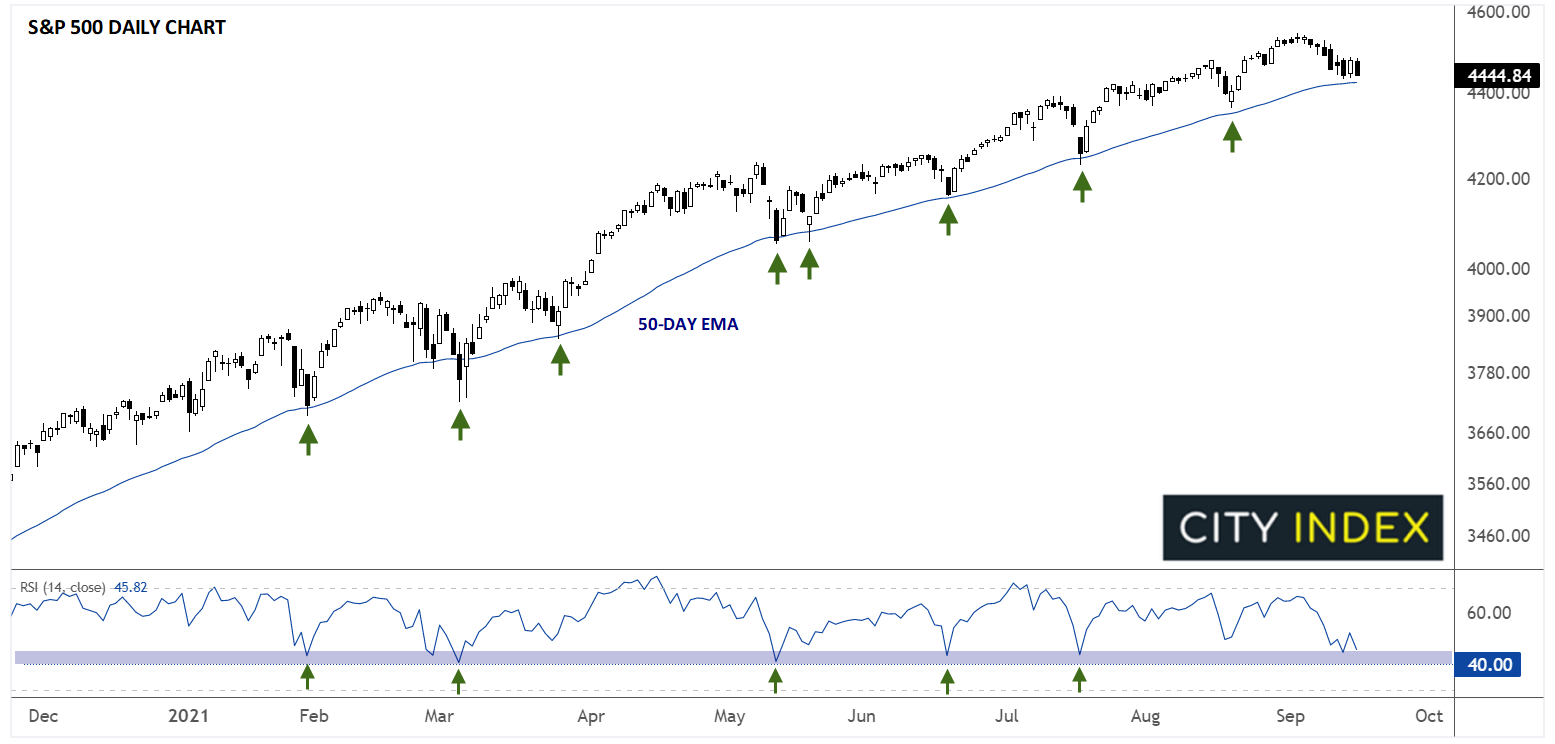 从技术面交易员的角度具体来看,也就是标普500指数在过去10个月里每次回落至50天EMA均线时,都会立即获撑并反弹至新高。同样,14天RSI在此期间多次探入40低点。