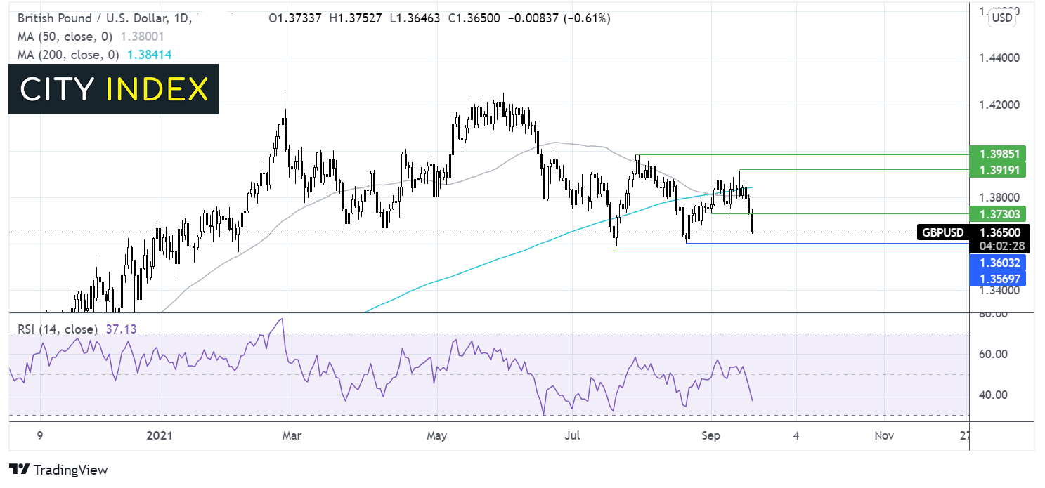 支撑位目前落在日图低点1.3650,但RSI看跌表明后市可能扩大下行。短线继续看跌,重点关注8月低点1.36和7月低点1.3570。