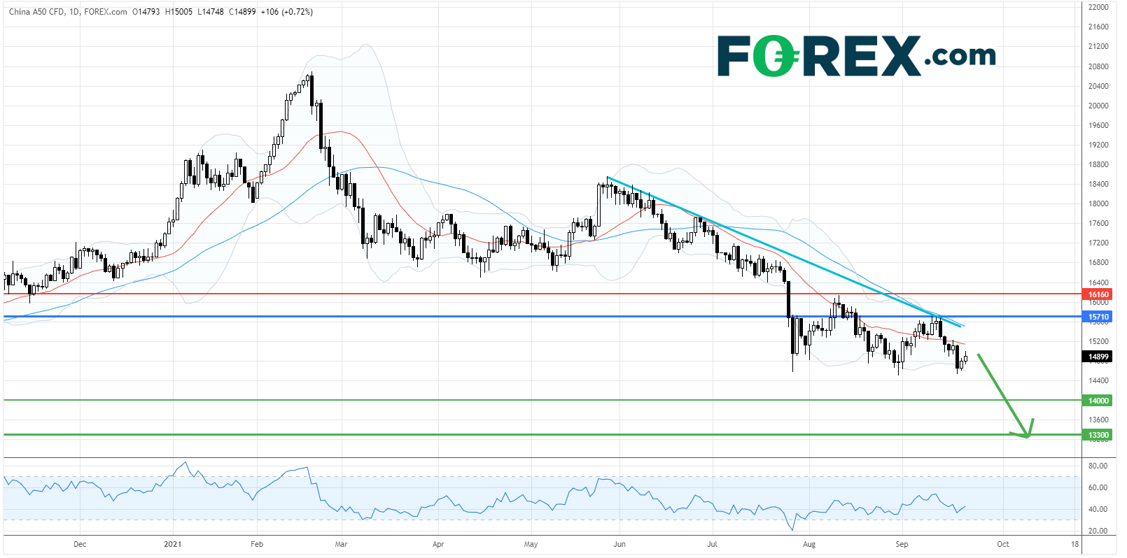 中国A50指数CFD : 走势看跌,首下行目标14,000点