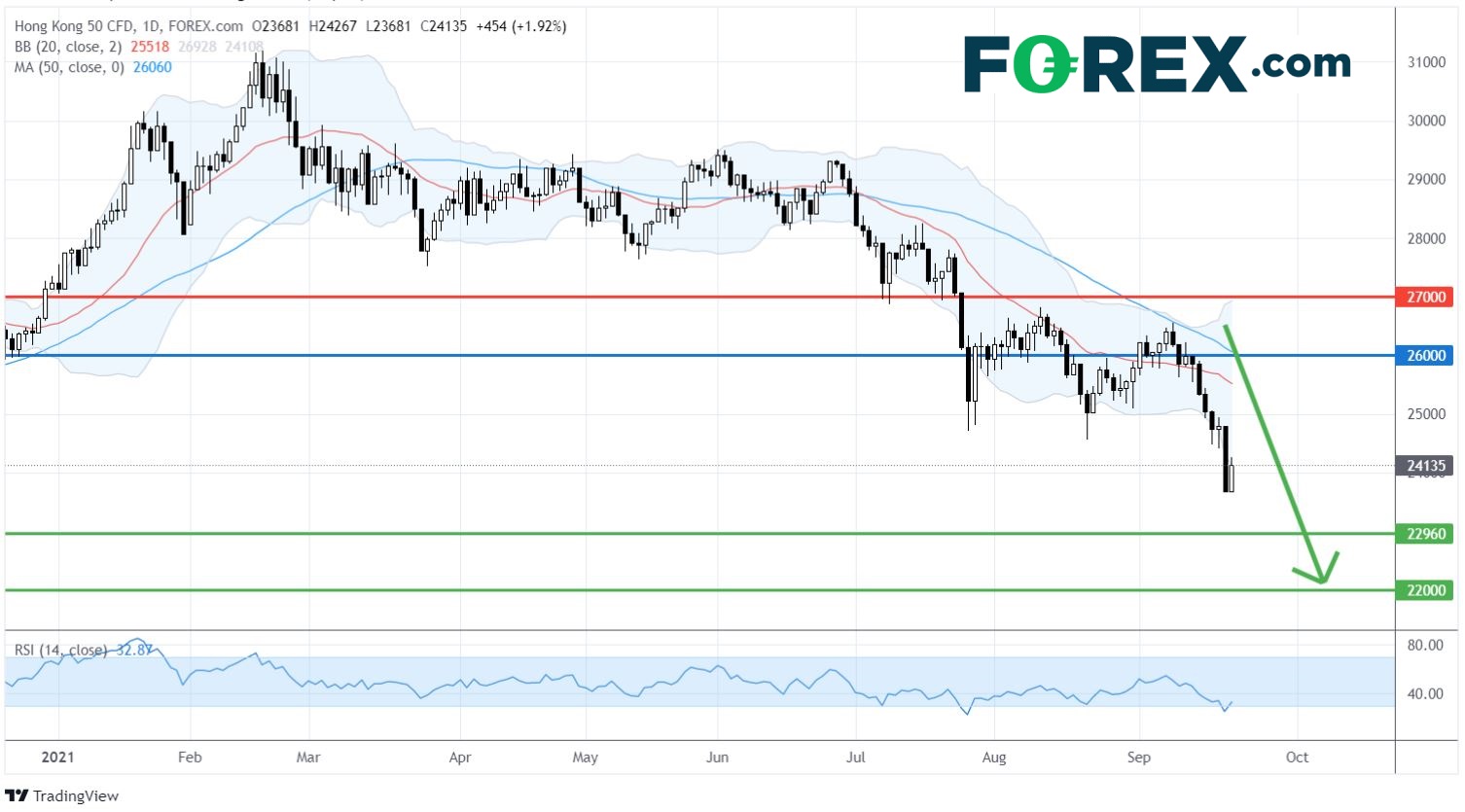 港股恒生指数 CFD在本月 (9月) 内急速从近26,500点下挫至24,000点以下,达一年低位。