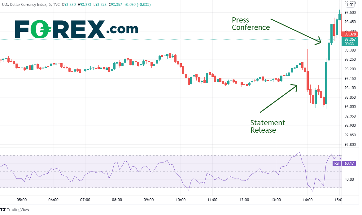 但请注意上图显示,价格在上述声明发布后30分钟左右发生了逆转。美联储主席在该声明发布后召开的新闻发布会上表示,“声明中的措词意在指出,可能最快在下次会议,缩表的标准就满足了”。他补充指出,“FOMC很多成员认为,就业通过了取得更多实质性进展的考验。我个人的观点是,距离满足缩表标准只有一步之遥”。声明中还有一句话是这样的:“缩表计划可能在明年年中落幕”。这些说法直截了当,是疫情爆发以来最强硬的表态,也出乎市场的意料。